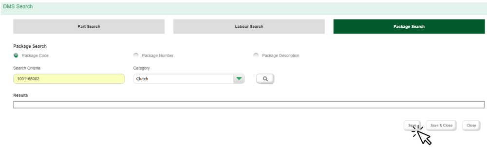 The final option on the DMS Search screen is Package Search. There are 3 options below to search from, a Package Code, a Package Number, and a Package Description. Once the user has inputted their criteria, they click search and the package shows in the results box.