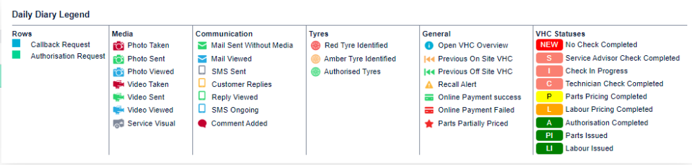 autoVHC uses icons to notify the user of certain information. From the Daily Diary Screen click the ! icon in the top right area of your Daily Diary screen to see the full legend which explains each icon and its various colours and meanings.