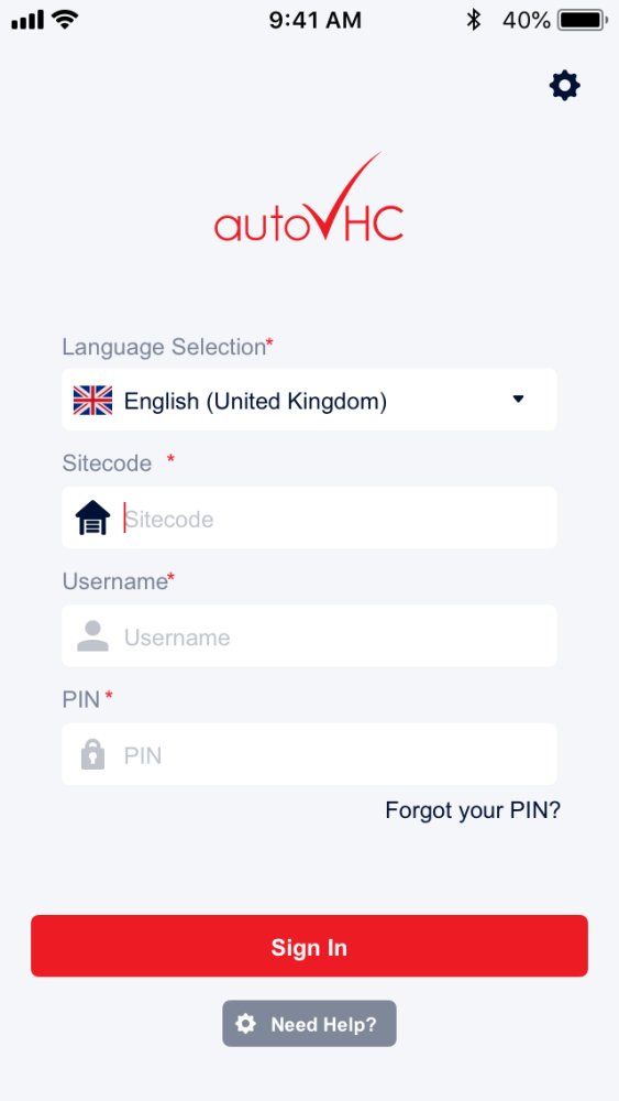 After starting the application users will be greeted with the login screen. Users login using the site code and their PIN.