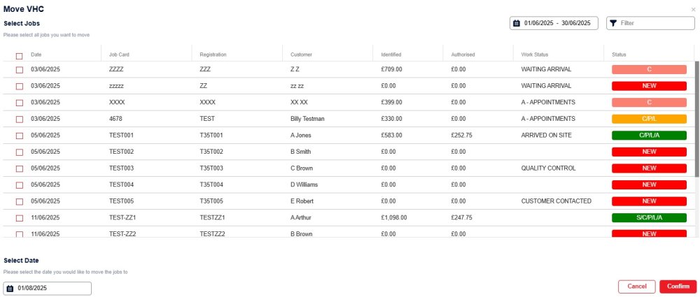 1. Select the VHCs to be moved by ticking the boxes on the left side.