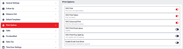 VHC Print Normal – This is the default print and is switched on by default for all sites.