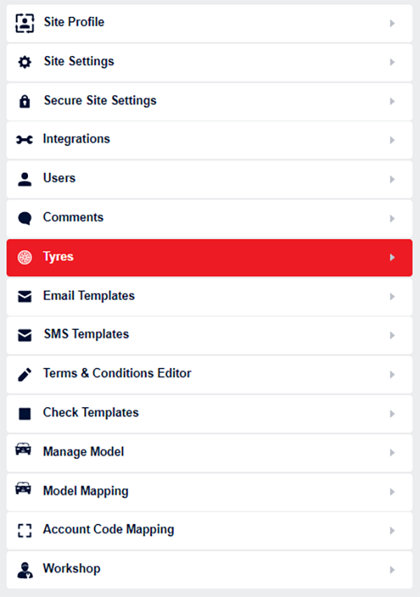 Tyres can be accessed from the navigation bar by clicking on Settings > Tyres