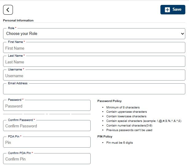Creating a user in autoVHC is quick and simple. Complete all fields as illustrated below and click save.
