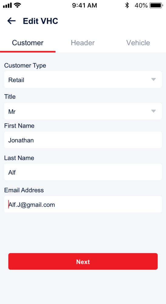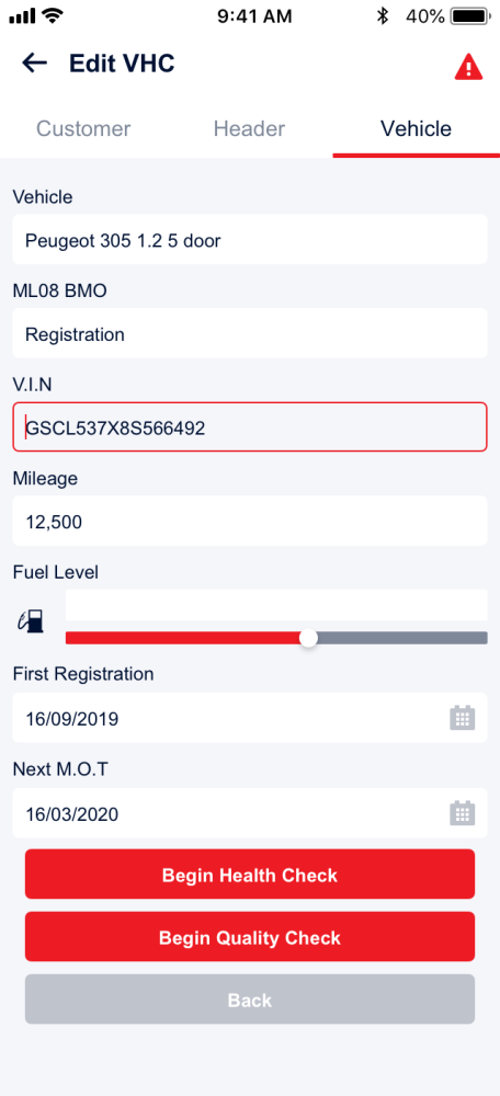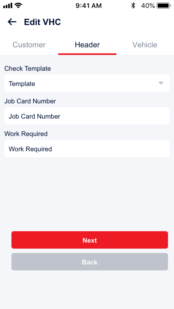 VHC Header screen contains vehicle information, the technician uses this screen to confirm the vehicle information.