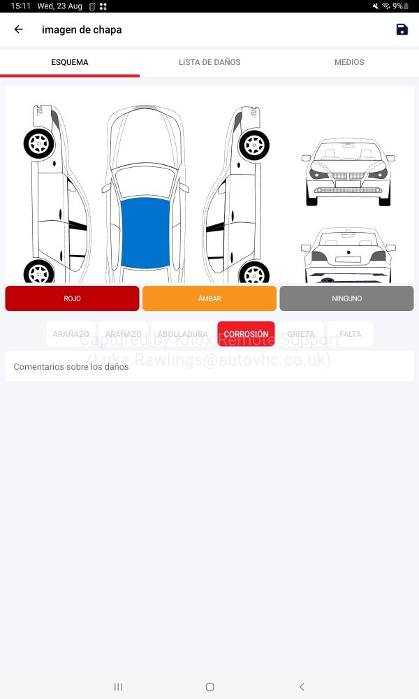 Después de seleccionar la sección del vehículo, el usuario debe seleccionar el estado rojo o ámbar, esto depende del daño. Después de seleccionar el estado de la sección, el usuario selecciona una categoría de daño y agrega un comentario.