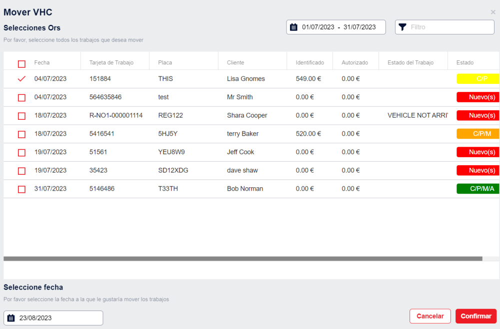 1. Seleccione los VHC que desea mover marcando las casillas del lado izquierdo.
