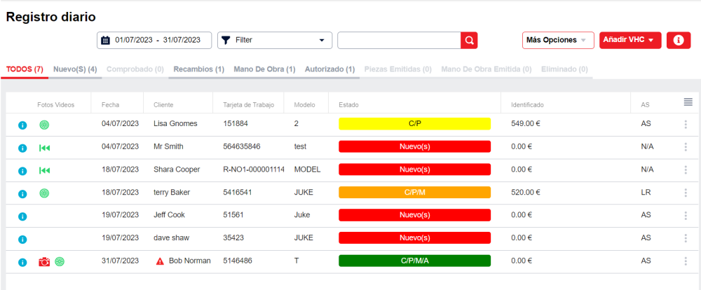 La parte principal de la pantalla de VHC en curso, y por lo tanto la mayoría de la página, se denomina el listado VHC. Éste mostrará todas las VHC a las que el concesionario haya accedido ya o bien las que estén pendientes de visitarse concesionario para el periodo seleccionado.