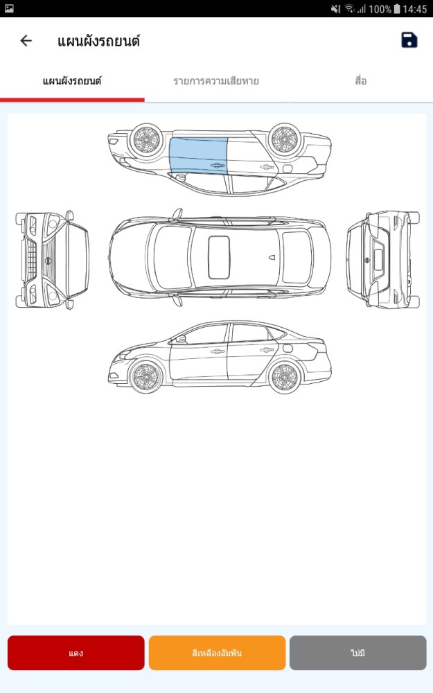 แผนภาพของรถใช้ในการระบุร่องรอยความเสียหายบนตัวรถ ช่วยให้ผู้ใช้โปรแกรมกำหนดรหัสให้ส่วนต่างๆ ของรถเป็นสีแดงหรือสีเหลือง