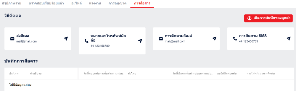 ขั้นที่สอง ในหน้าแฟ้มข้อมูลรถ คลิกที่แท็บ “การติดต่อ (communication)” ที่อยู่ด้านบน
